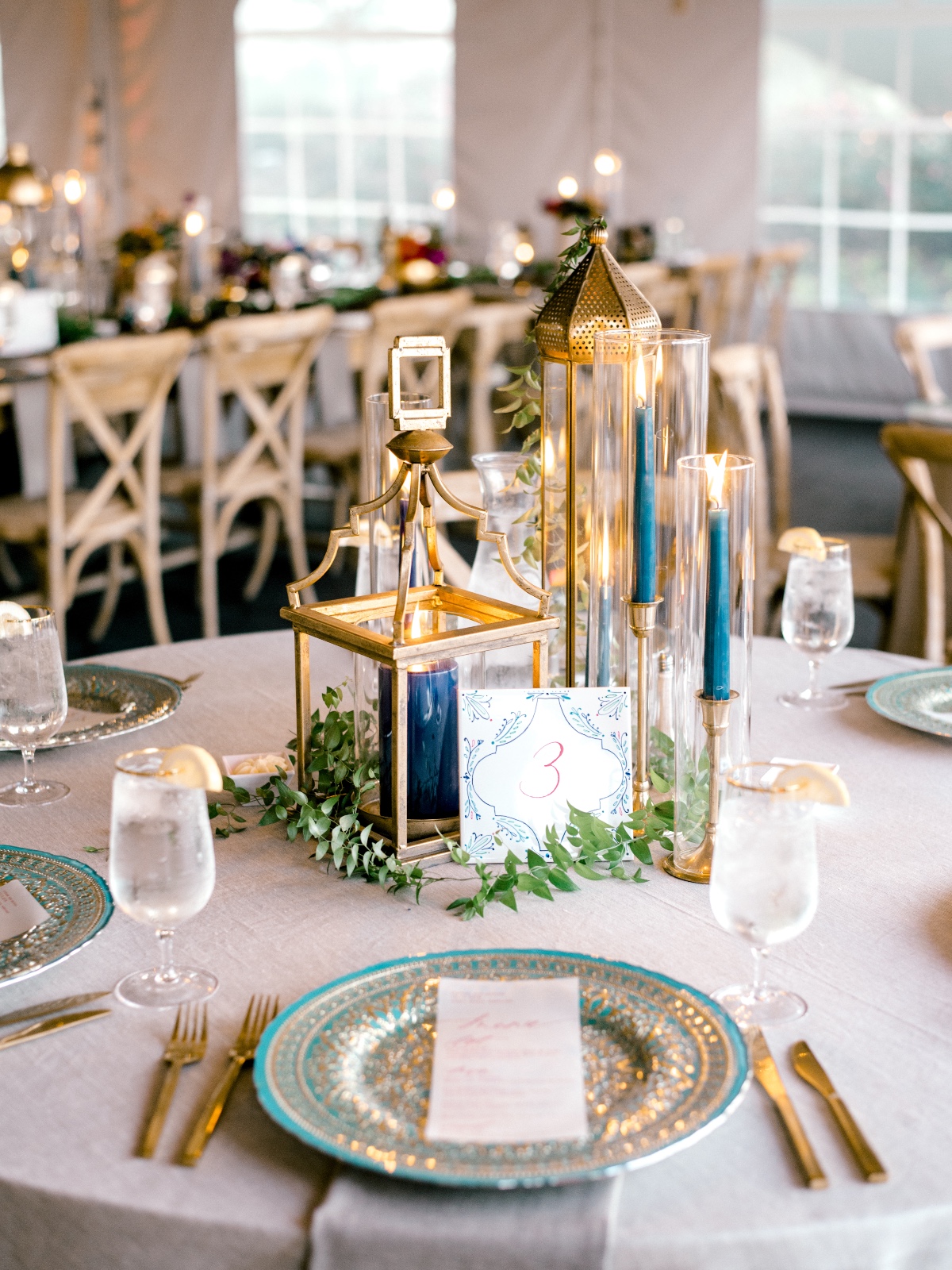 Elevate the look of your reception by incorporating Moroccan lanterns on dinner tables, along with green branches as a table runner and embroidered placemats.